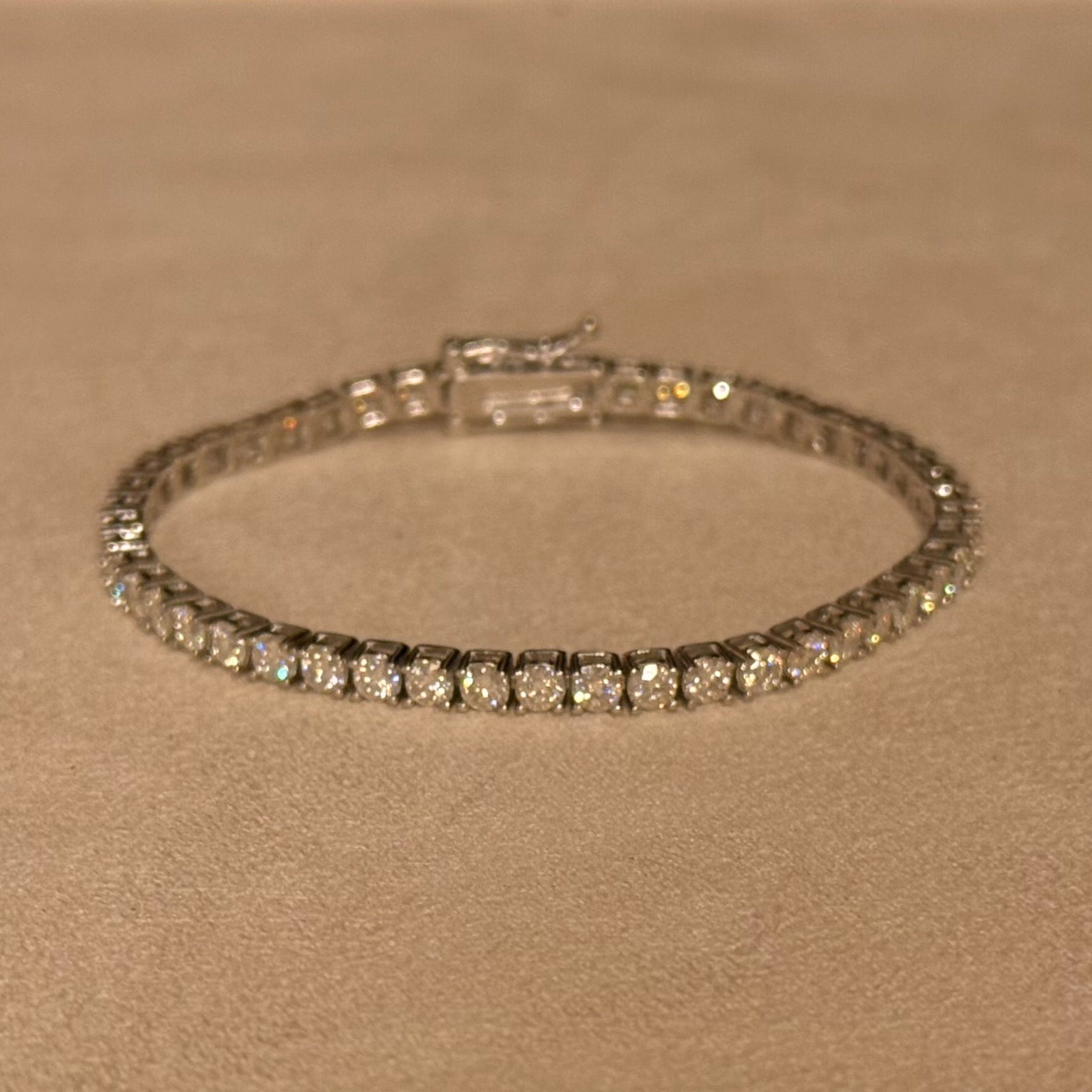This bracelet features moissanite stones known for their brilliance and durability, closely resembling the look of fine diamonds. Unlike cubic zirconia, moissanite retains its clarity and sparkle over time and will not cloud or dull with wear. Each stone is set in sterling silver and plated in 18k yellow or white gold, giving it a rich, refined finish with lasting comfort and wearability.